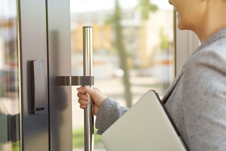 These days, the most common option for main entrance doors is an access control system. This typically provides employees with entry to the building via a uniquely encoded electronic access card. You can activate and deactivate cards online, and the system tracks activity at the building level.